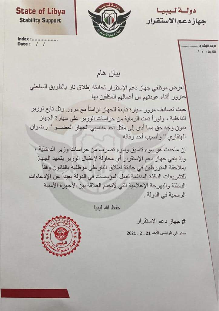 وكانت وزارة الداخلية بحكومة الوفاق الليبية ذكرت في بيان أن "سيارة مسلحة مصفحة قامت بالرماية المباشرة على موكب وزير الداخلية باستعمال أسلحة رشاشة".