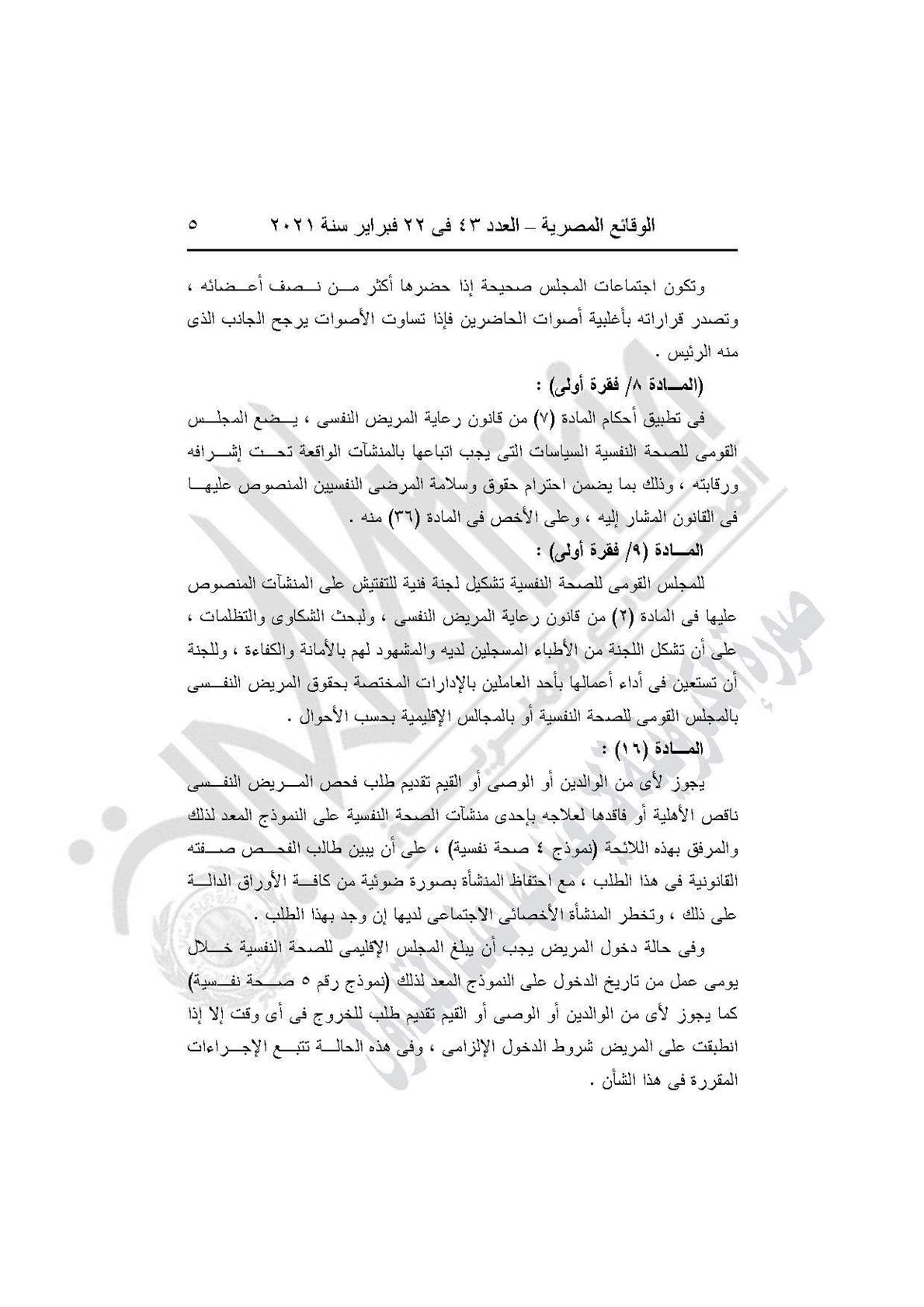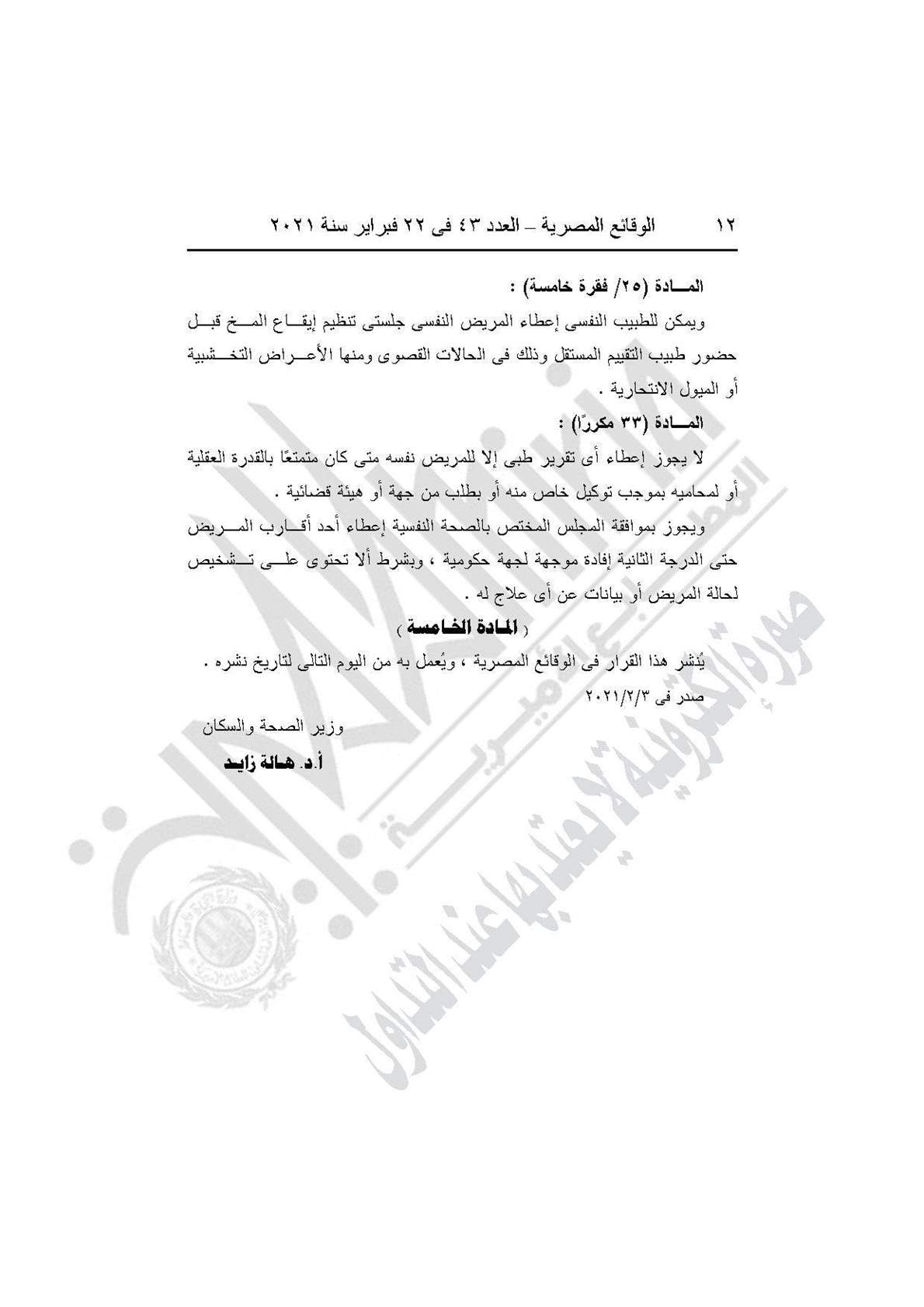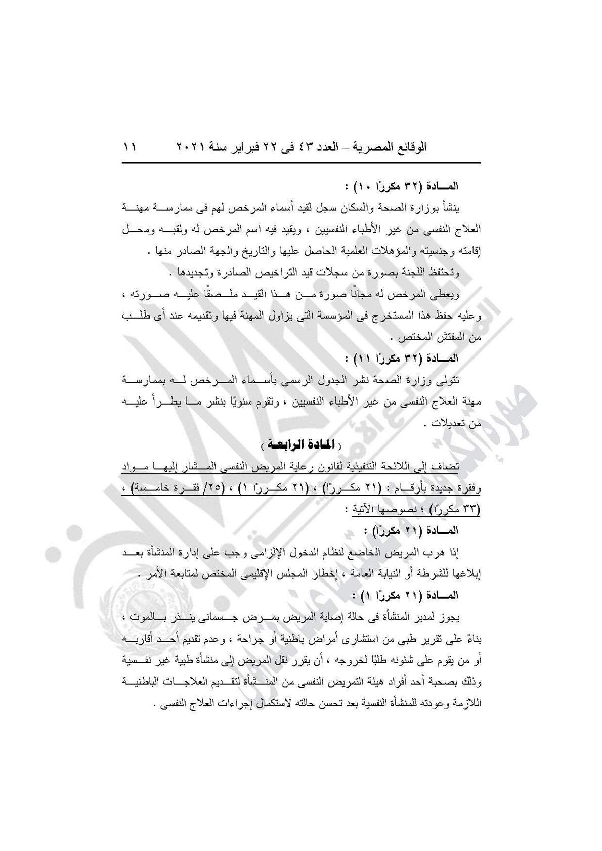 نشرت جريدة الوقائع المصرية في عددها رقم 43، الصادر في 22 فبراير 2021، قرار وزارة الصحة والسكان رقم 55 لسنة 2021، بتعديل بعض أحكام اللائحة التنفيذية لقانون رعاية المريض النفسى الصادرة بقرار وزير الصحة رقم 128 لسنة 2010.