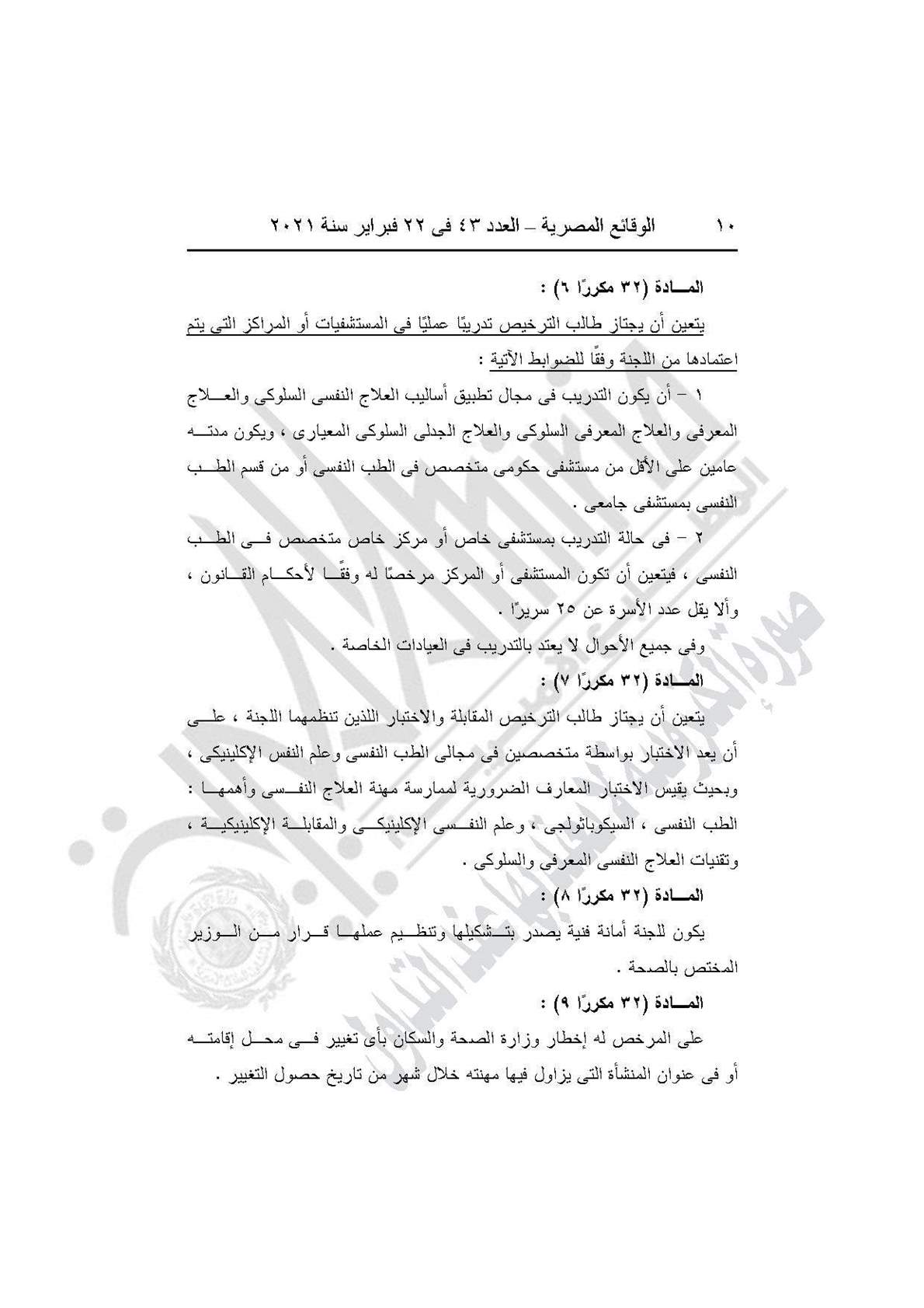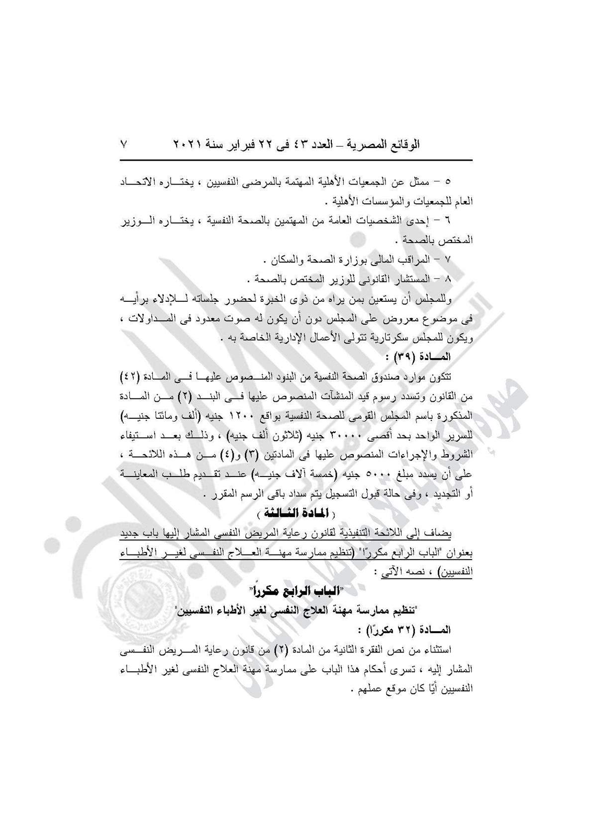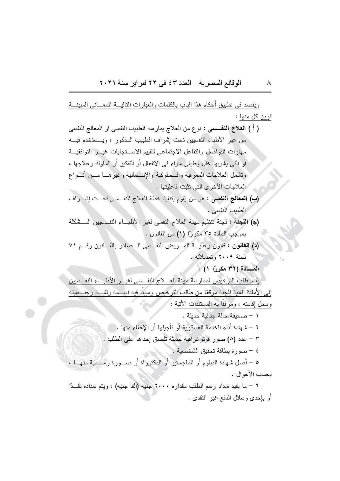 نشرت جريدة الوقائع المصرية في عددها رقم 43، الصادر في 22 فبراير 2021، قرار وزارة الصحة والسكان رقم 55 لسنة 2021، بتعديل بعض أحكام اللائحة التنفيذية لقانون رعاية المريض النفسى الصادرة بقرار وزير الصحة رقم 128 لسنة 2010.