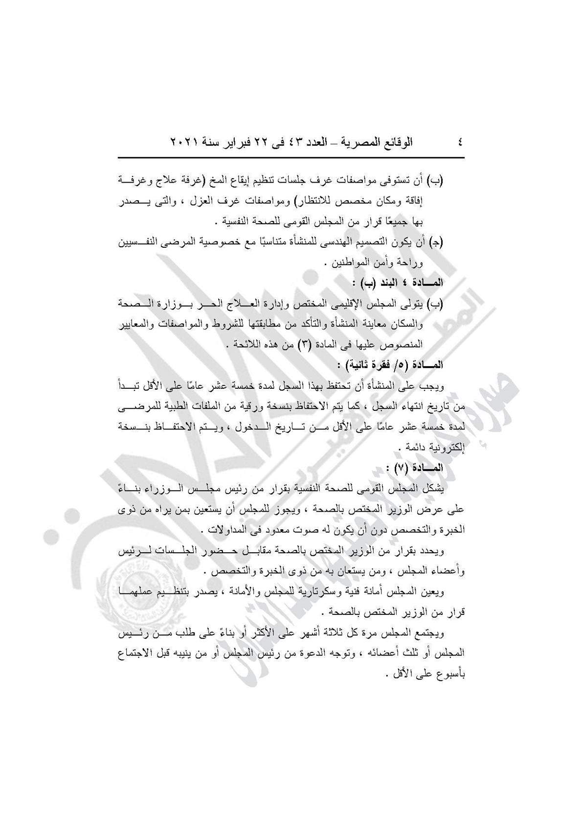 وفي المـادة الثالثة "يشترط للترخيص الصادر من وزارة الصحة والسكان بإدارة أو تشغيل أى منشأة من منشآت الصحة النفسية ما يأتى : ( أ ) أن تتبع معايير السلامة البيئية والإكلينيكية التى يصدر بها قرار من المجلس القومى للصحة النفسية. (ب) أن تستوفى مواصفات غرف جلسات تنظيم إيقاع المخ (غرفة علاج وغرفة إفاقة ومكان مخصص للانتظار) ومواصفات غرف العزل ، والتى يصدر بها جميعًا قرار من المجلس القومى للصحة النفسية . (ﺠ) أن يكون التصميم الهندسى للمنشأة متناسبًا مع خصوصية المرضى النفسيين وراحة وأمن المواطنين.
