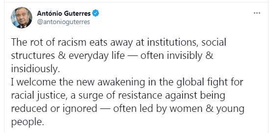 وقال جوتيرش: "أرحب بالصحوة الجديدة في النضال العالمي من أجل العدالة العرقية، واندفاع المقاومة ضد التقليل أو التجاهل، غالبًا بقيادة النساء والشباب".