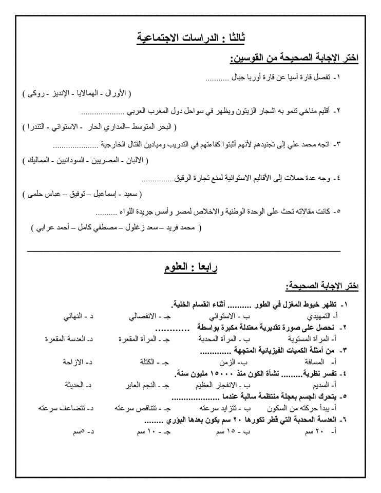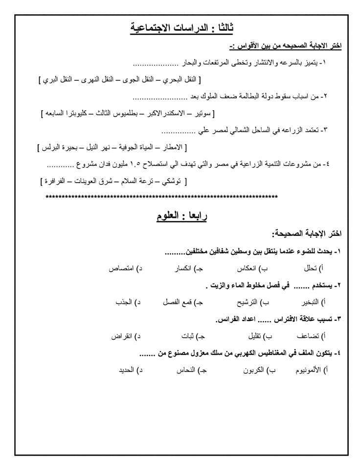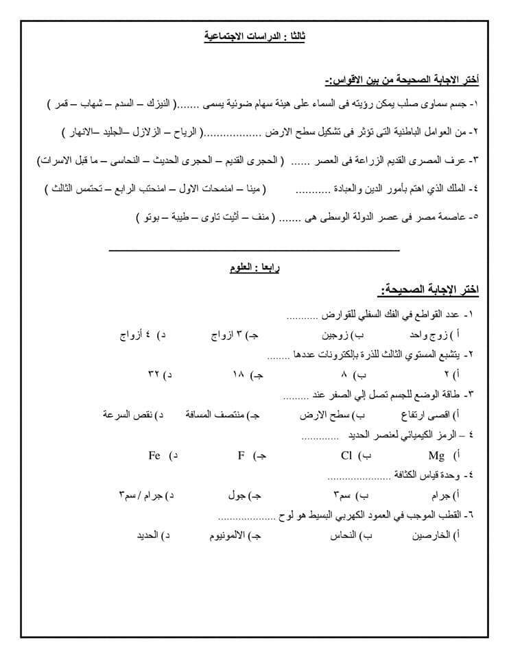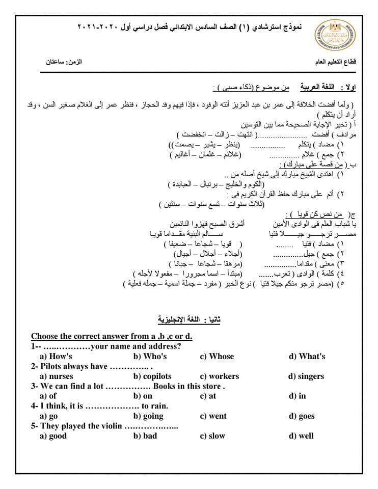 نماذج استرشادية للامتحان الموحد لطلاب الصف السادس الابتدائي