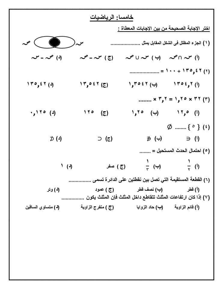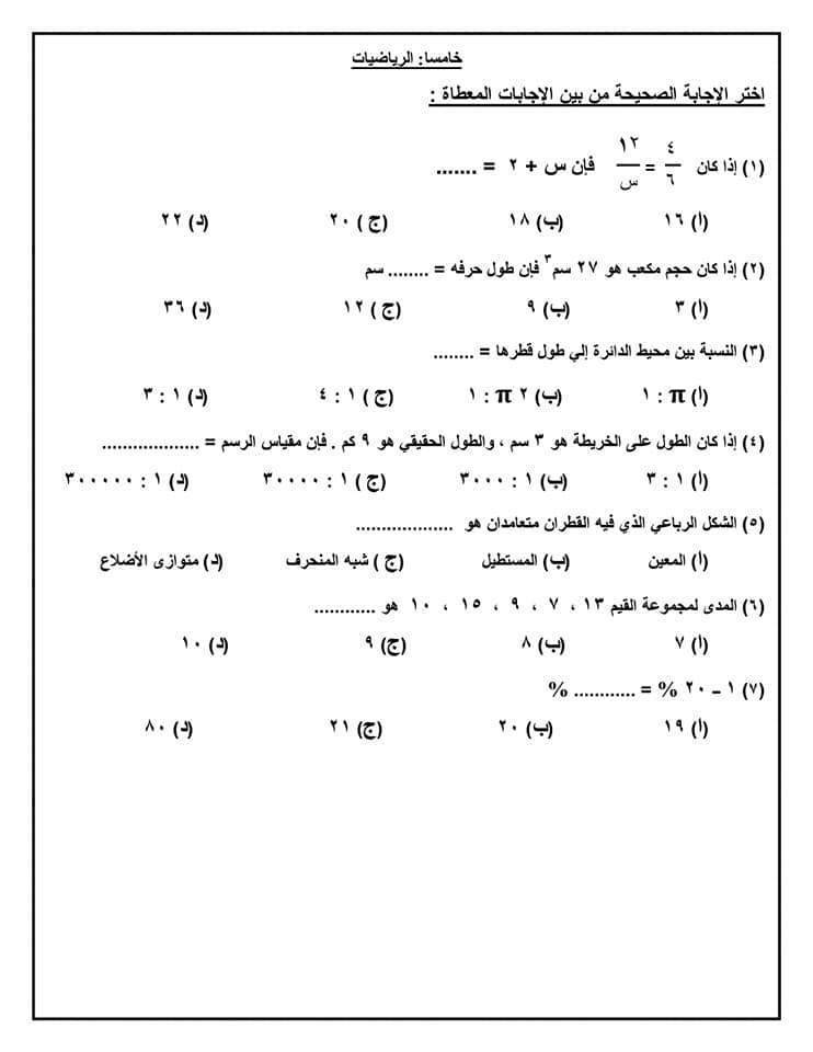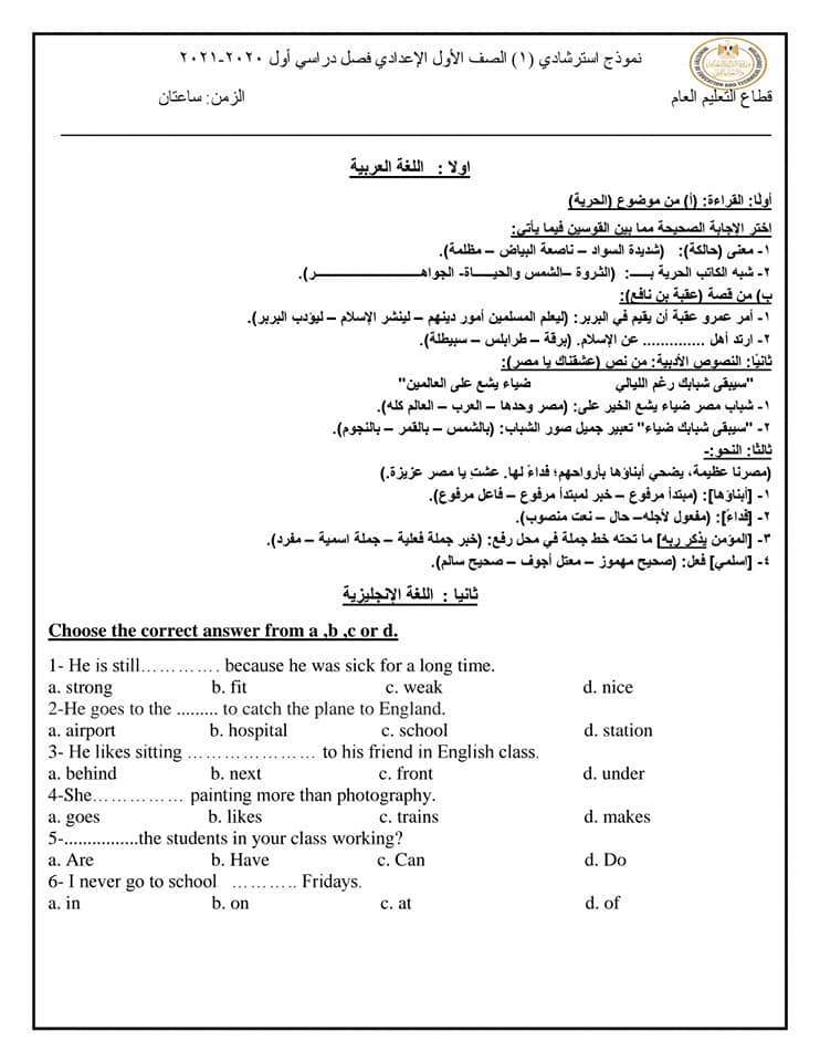 نماذج استرشادية للامتحان الموحد لطلاب الصف الأول الإعدادي