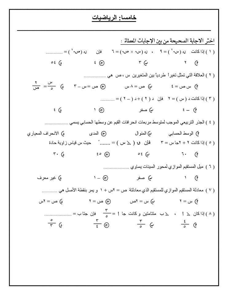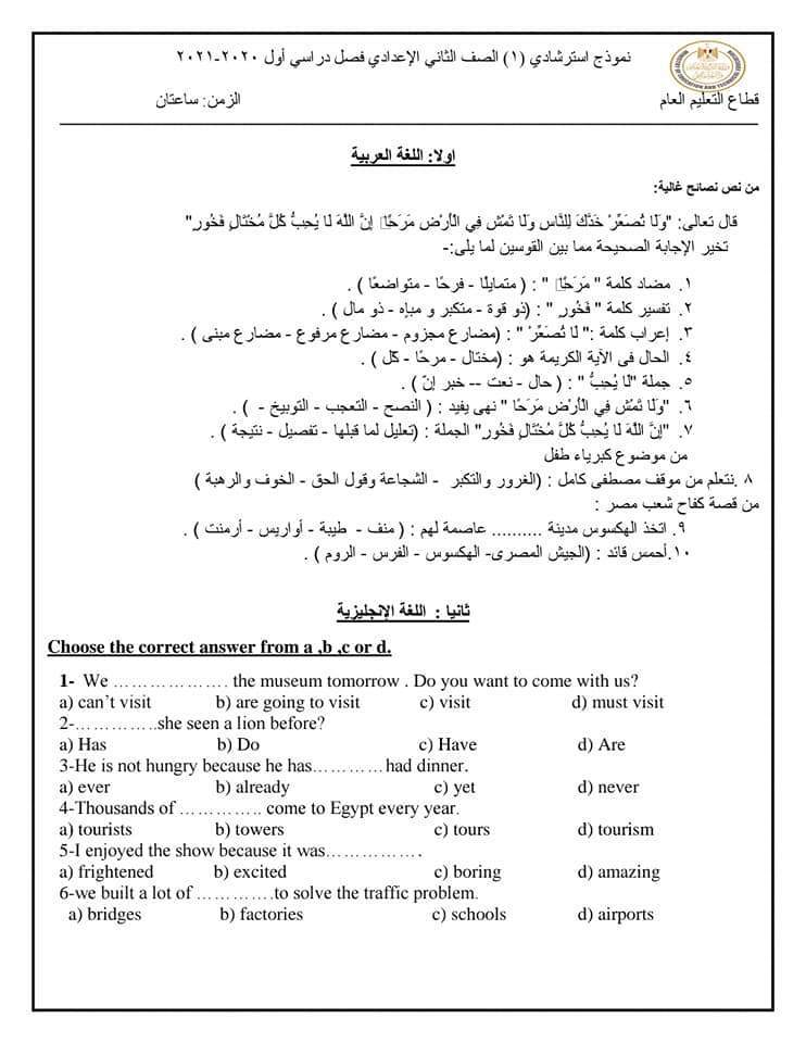 نماذج استرشادية للامتحان الموحد لطلاب الصف الثاني الإعدادي