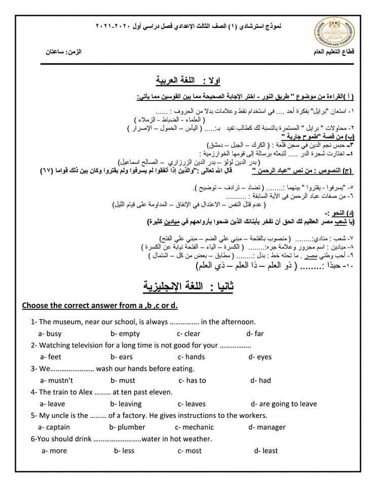 نماذج استرشادية للامتحان الموحد لطلاب الصف الثالث الإعدادي