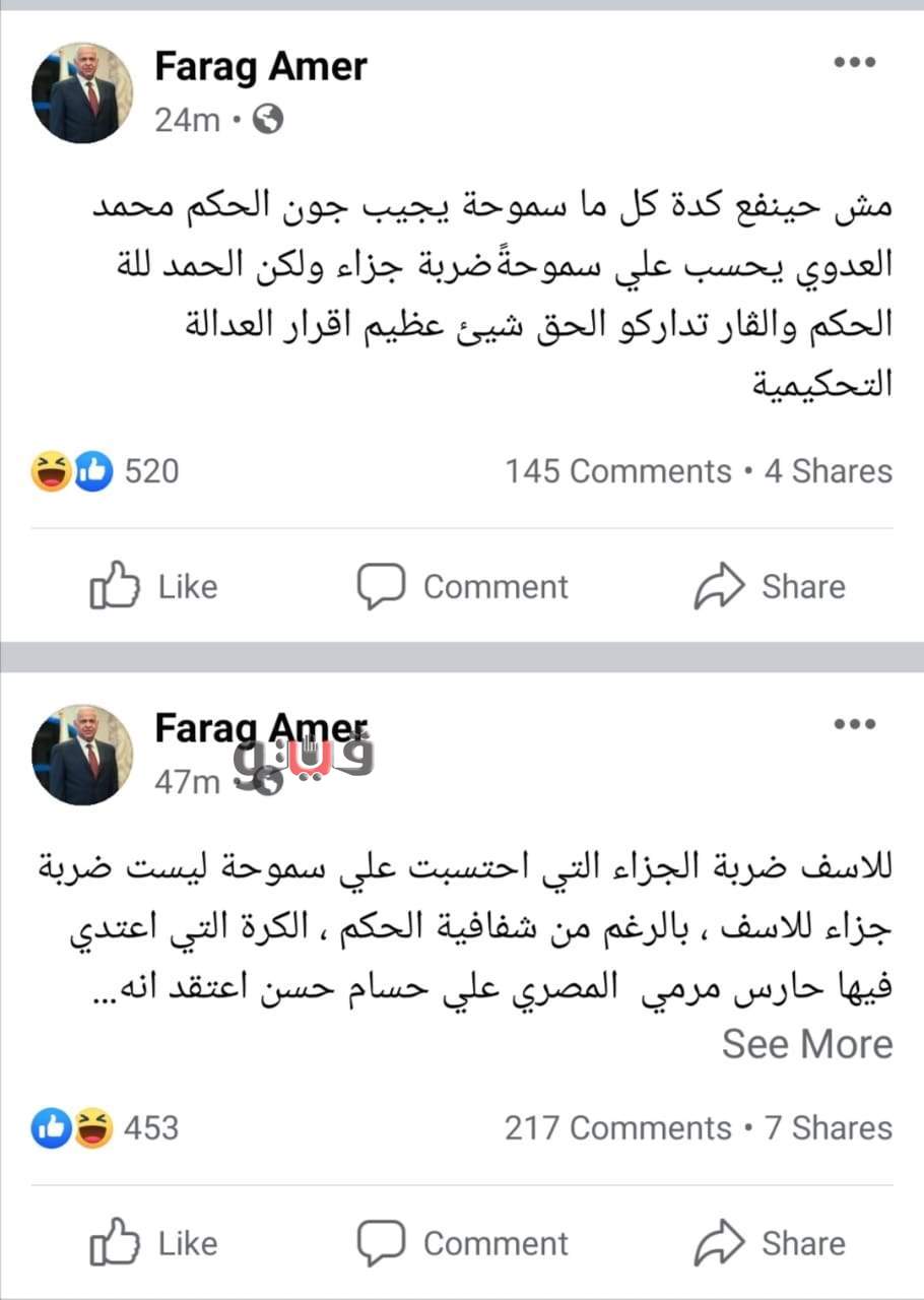 وانتقد رئيس نادي سموحة الأداء التحكيمي خلال المباراة، وقال عامر عبر حسابه الشخصي على فيس بوك، "للأسف ضربة الجزاء التي احتسبت على سموحة ليست ضربة جزاء، بالرغم من شفافية الحكم، والكرة التي اعتدي فيها حارس مرمي المصري علي حسام حسن أعتقد أنها ضربة جزاء والله أعلم."