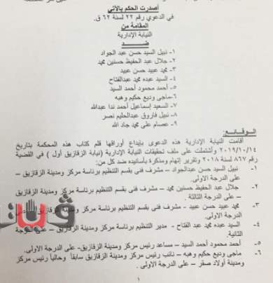 تضم قائمة المحالين الصادر بحقهم حكم البراءة كلًا من نبيل السيد حسن وجلال عبد الحفيظ حسنين ومحمد عبيد حسن، مشرفون فنيون بقسم التنظيم برئاسة مركز ومدينة الزقازيق والسيد عبده محمد، مدير التنظيم وأحمد محمود السيد،مساعد رئيس مركز ومدينة الزقازيق وماجي وديع حليم، رئيس مدينة أولاد صقر والسعيد اسماعيا أحمد، مشرف بقسم الإزالات ونبيل فاروق عبد الحليم، رئيس مدينة الإبراهيمية وعصام علي محمد، سكرتير عام مساعد محافظة الشرقية