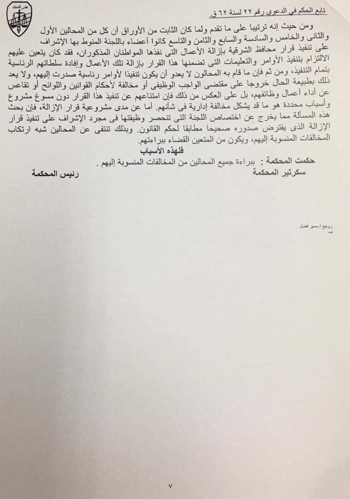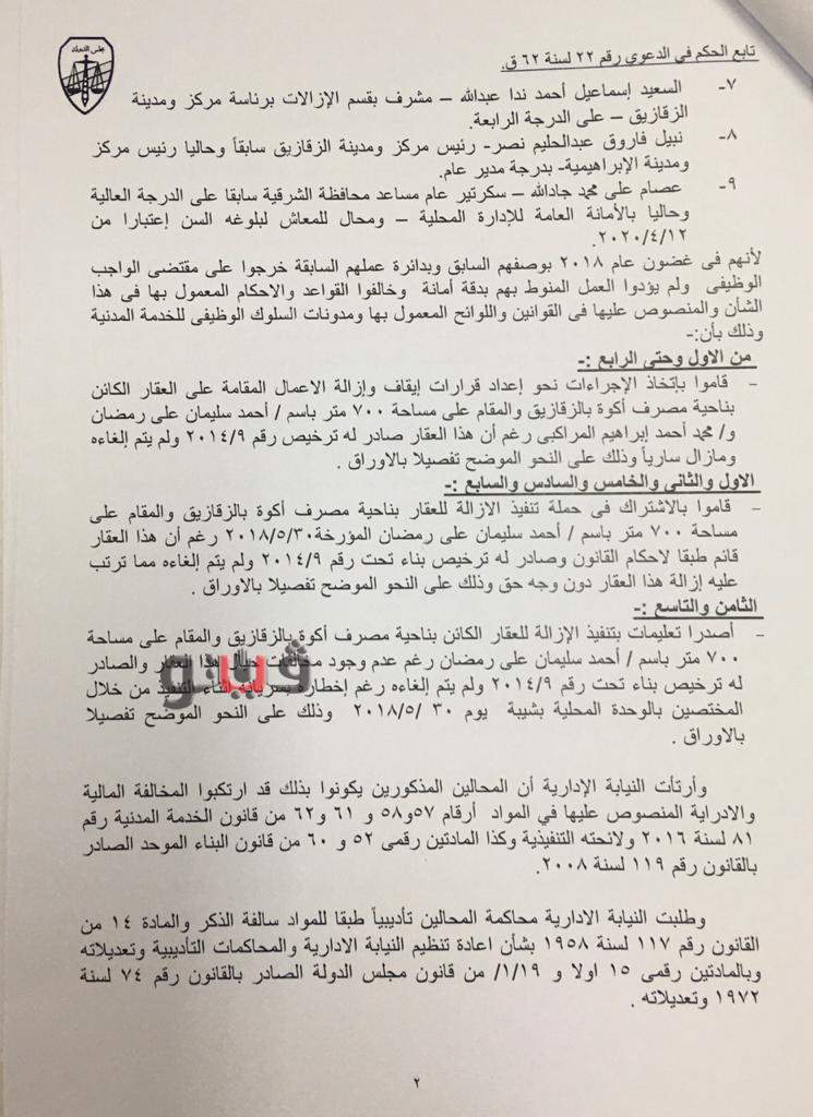 أصدرت المحكمة التأديبية العليا بمجلس الدولة حكمها في القضية رقم 22 لسنة 62 قضائية عليا ببراءة سكرتير عام مساعد محافظة الشرقية وثلاثة من رؤساء المدن وخمسة مسئولين آخرين بعد ثبوت عدم ارتكابهم مخالفات مالية وإدارية جسيمة ولم يصدروا قرارات إزالة للعقارات المرخصة