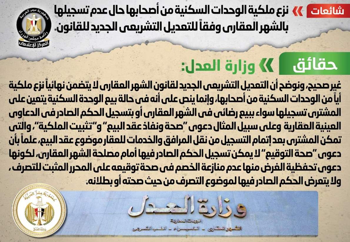 وتواصل المركز الإعلامي لمجلس الوزراء مع وزارة العدل، والتي نفت تلك الأنباء، مُؤكدةً أنه لا صحة لنزع ملكية الوحدات السكنية من أصحابها حال عدم تسجيلها بالشهر العقاري وفقاً للتعديل التشريعي الجديد للقانون.