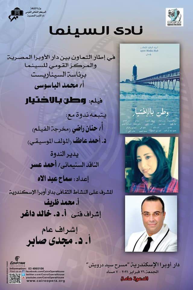 تنظم دار الأوبرا المصرية، برئاسة الدكتور مجدى صابر حفلا فنيا لنادى سينما أوبرا الاسكندرية يوم الجمعة المقبل الموافق ٢٦ من فبراير الجارى، وذلك فى تمام الساعة السابعة مساء، حيث يتم عرض الفيلم الوثائقى "وطن بالاختيار" من اخراج حنان راضى وذلك بالتعاون مع المركز القومى للسينما برئاسة السيناريست محمد الباسوسى.