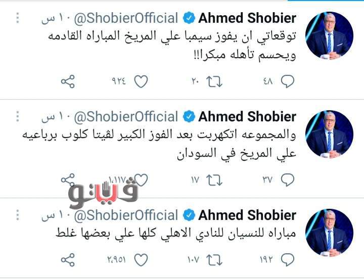 وكتب "شوبير" على الصفحة الشخصية بموقع التواصل الاجتماعي "تويتر": "مباراة للنسيان للنادي الأهلي كلها على بعضها غلط، والمجموعة اتكهربت بعد الفوز الكبير لڤيتا كلوب برباعية على المريخ في السودان".