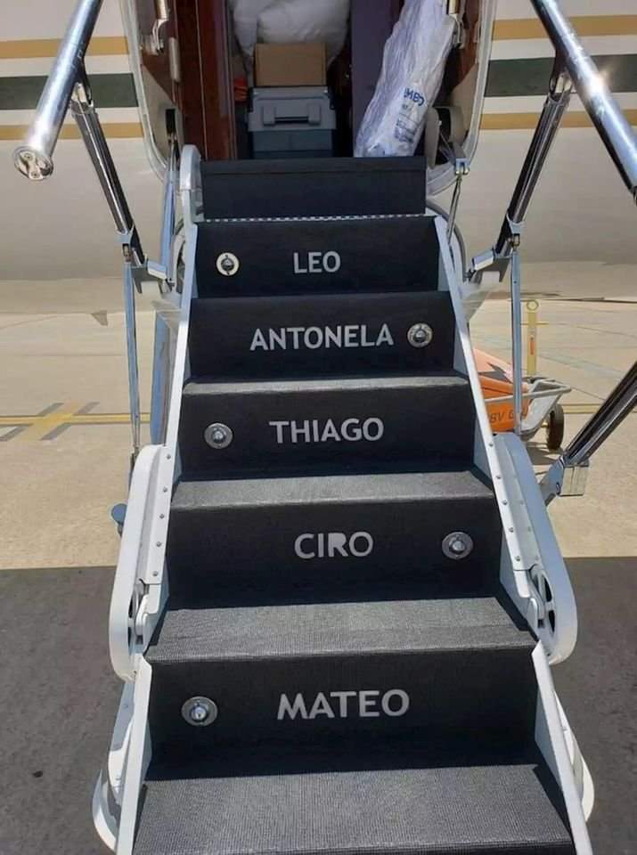 وأشارت الصحيفة أنه تنفيذا لطلب من ميسي تم كتابة رقم 10 في مؤخرة الطائرة إضافة إلى اسمه على الهيكل الخارجي، وعلى سلم الطائرة طبع اسم ليو إضافة إلى اسم زوجته أنتونيلا وأسماء أبنائه الثلاثة تياجو وسيرو وماتيو.