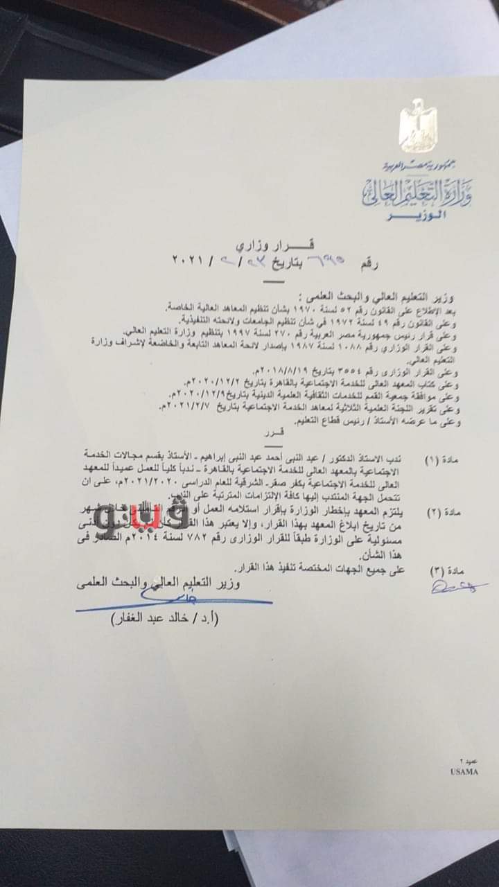 العالى للخدمة الاجتماعية بالقاهرة ندبا كليا الى وظيفة عميد المعهد العالى