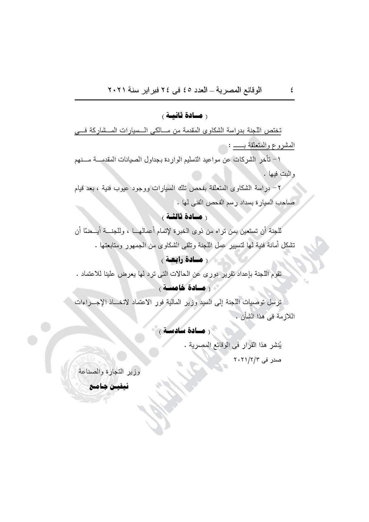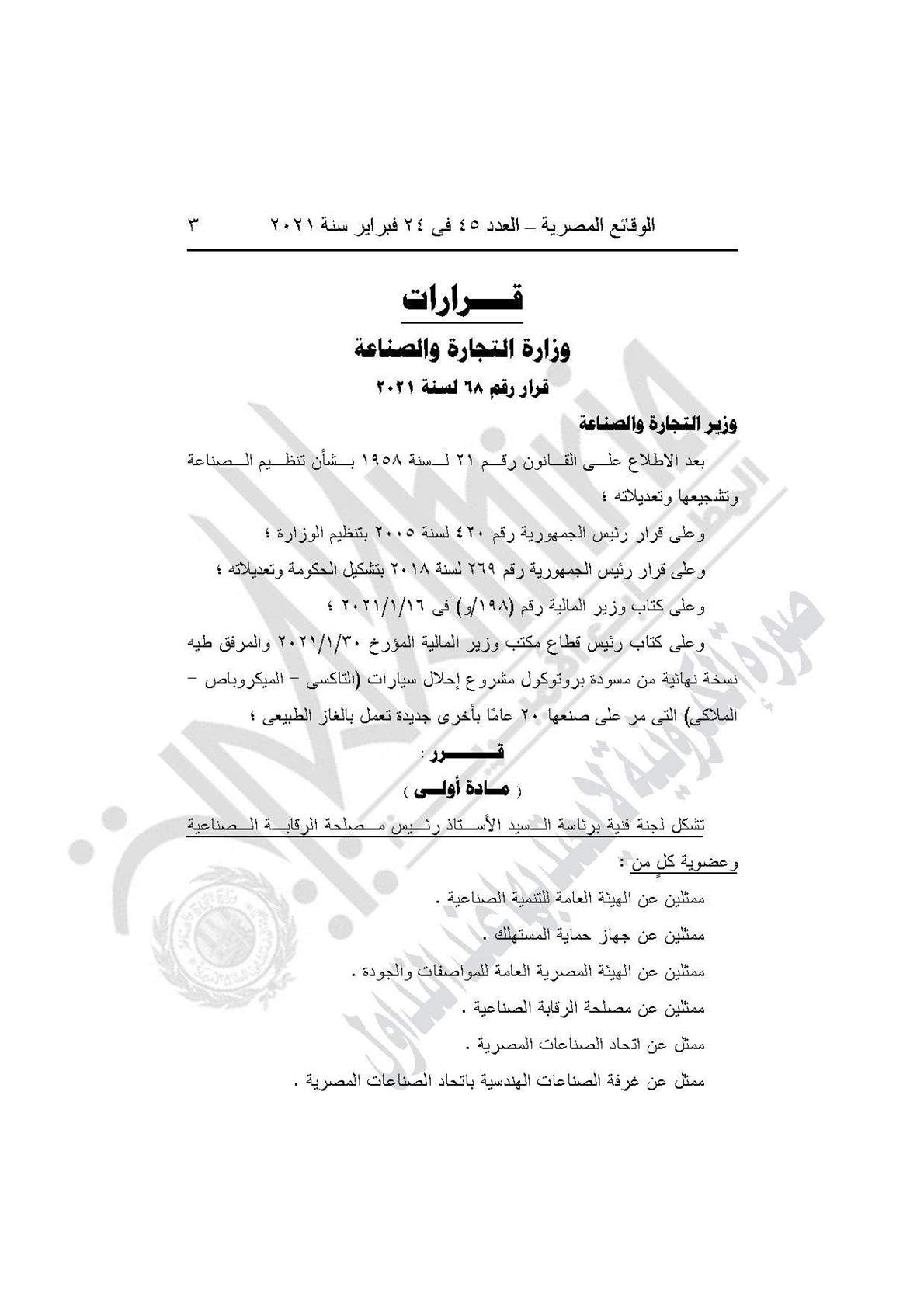 نشرت جريدة الوقائع المصرية في عددها رقم 45، الصادر في 24 فبراير 2021، قرار وزارة التجارة والصناعة رقم 68 لسنة 2021، بشأن تشكيل لجنة فنية برئاسة رئيس مصلحة الرقابة الصناعية لمشروع إحلال سيارات (التاكسي، الميكروباص، الملاكي) التي مر على صنعها 20 عامًا بأخرى جديدة تعمل بالغاز الطبيعي.