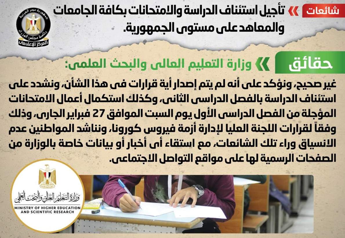 وتواصل المركز الإعلامي لمجلس الوزراء مع وزارة التعليم العالي والبحث العلمي، والتي نفت تلك الأنباء، مُؤكدةً أنه لا صحة لتأجيل استئناف الدراسة والامتحانات بكافة الجامعات والمعاهد على مستوى الجمهورية، وأنه لم يتم إصدار أية قرارات في هذا الشأن.