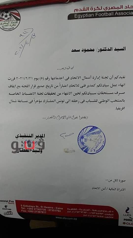 وأعلن اتحاد الكرة رسميا إنهاء عمل الدكتور محمود سعد المدير الفني للاتحاد وتوجيه الشكر له عما قدمه خلال الفترة السابقة مع استكمال إعادة هيكلة الإدارة الفنية بالاتحاد ومناقشة الأسماء المرشحة خلال الاجتماع المقبل للجنة المكلفة بإدارة الاتحاد.