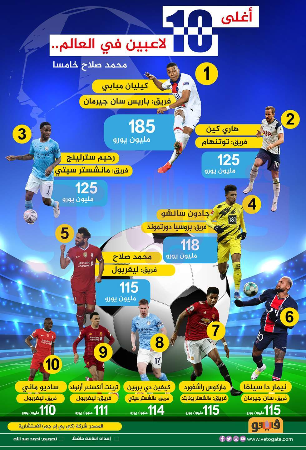 أغلى 10 لاعبين في العالم.. محمد صلاح خامسا | إنفوجراف