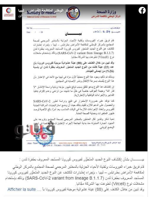 وقال المركز في بيان إن "فريق خبراء بالمركز الوطني لمكافحة الأمراض بطرابلس قام بإجراء اختبارات للكشف عن النوع الجديد المتحور لفيروس كورونا المستجد المعروف بطفرة لندن".