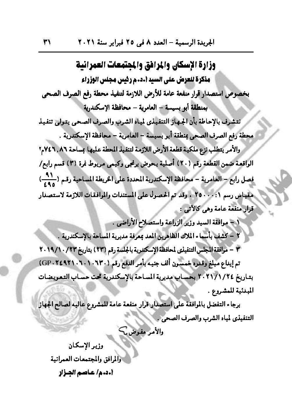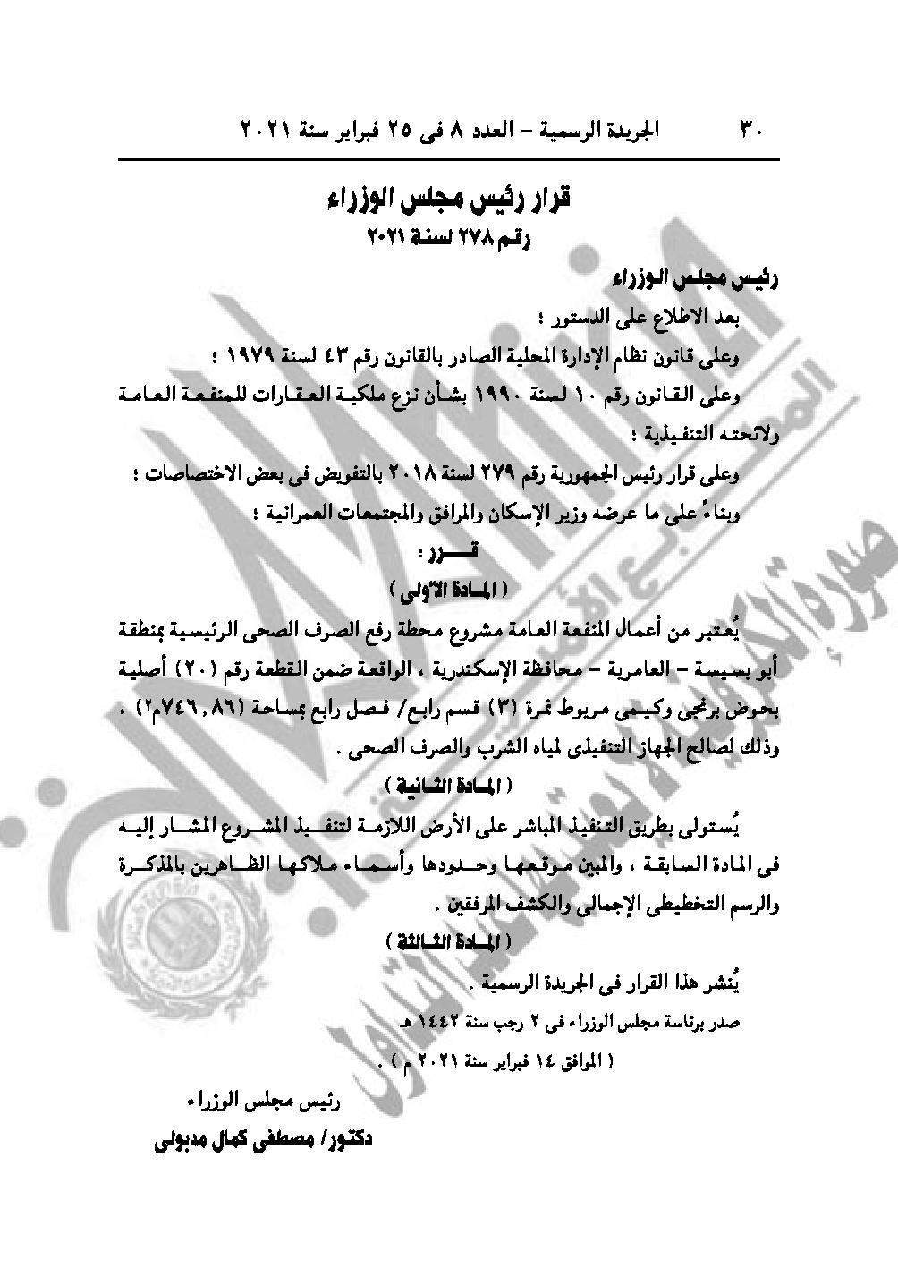 نشرت الجريدة الرسمية في عددها رقم 8، الصادر في 25 فبراير 2021، قرار رئيس مجلس الوزراء الدكتور مصطفى مدبولي رقم 278 لسنة 2021، بشأن اعتبار مشروع محطة رفع الصرف الصحي الرئيسية بمنطقة أبو بسيسة العامرية بمحافظة الإسكندرية من أعمال المنفعة العامة.