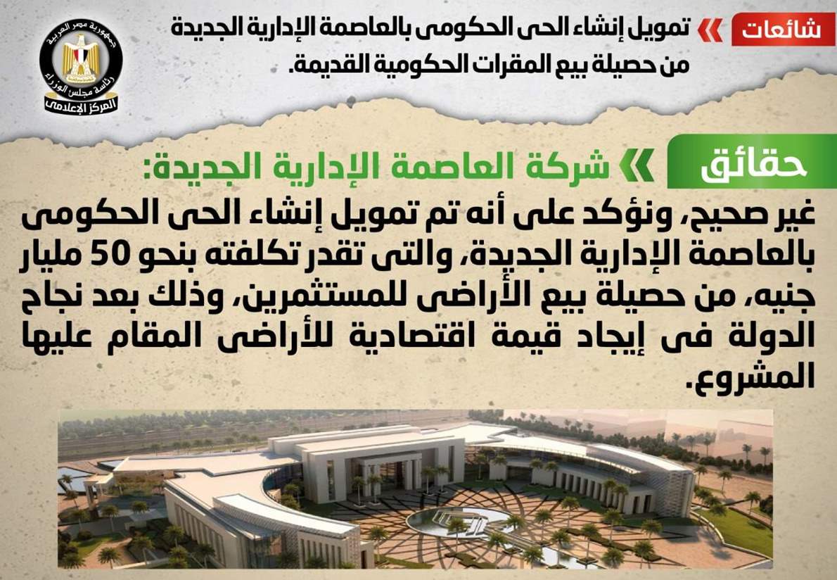 وتواصل المركز الإعلامي لمجلس الوزراء مع شركة العاصمة الإدارية الجديدة، والتي نفت تلك الأنباء، مُؤكدةً أنه لا صحة لتمويل إنشاء الحي الحكومي بالعاصمة الإدارية الجديدة من حصيلة بيع المقرات الحكومية القديمة.