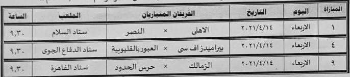 ومن المقرر أن يواجه النادي الأهلي فريق النصر يوم 14 أبريل على استاد السلام ، بينما يواجه الزمالك فريق حرس الحدود في نفس اليوم على استاد القاهرة .