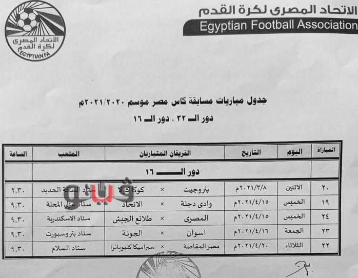 حددت إدارة المسابقات بالاتحاد المصري لكرة القدم مواعيد وملاعب المباريات المؤجلة من الدور 32 لبطولة كأس مصر على النحو التالي: