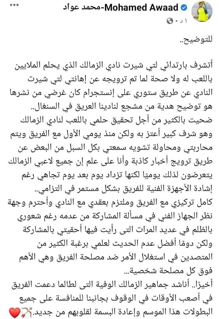 وتابع: أخيرًا.. أناشد جماهير الزمالك الوفية التى لطالما دعمت الفريق في أصعب الأوقات في الوقوف بجانبنا للمنافسة على جميع البطولات هذا الموسم وإعادة البسمة لقلوبهم من جديد.