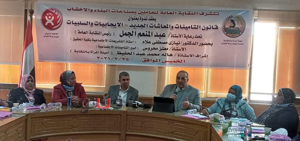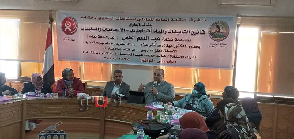جاء ذلك خلال ندوة عقدتها النقابة العامة للعاملين بالبناء والأخشاب، برئاسة عبد المنعم الجمل، بمركز التدريب المهني المتطور، تحت عنوان (قانون التأمينات والمعاشات الجديد.. الإيجابيات والسلبيات )، بمشاركة أمانة المرأة بالنقابة العامة، برئاسة هالة محمد عبد الحفيظ.