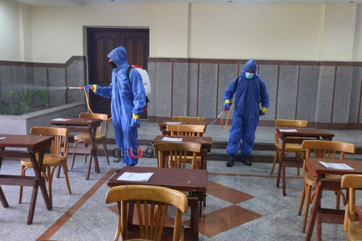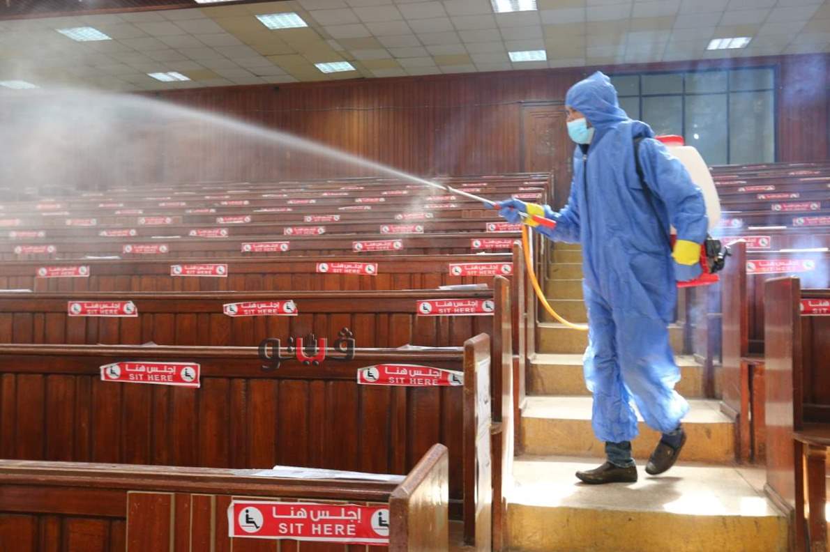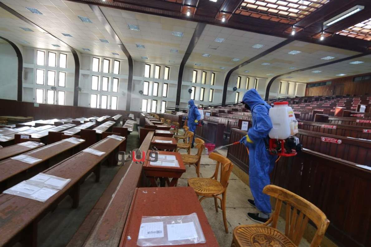 وتم تطهير المدرجات وقاعات الامتحانات بواسطة فرق مكافحة العدوى في رش المدرجات وبالمواد المطهرة، كما وضعت مسارات مرور الطلاب ووزعت مقياس الحرارة على أفراد الأمن.
