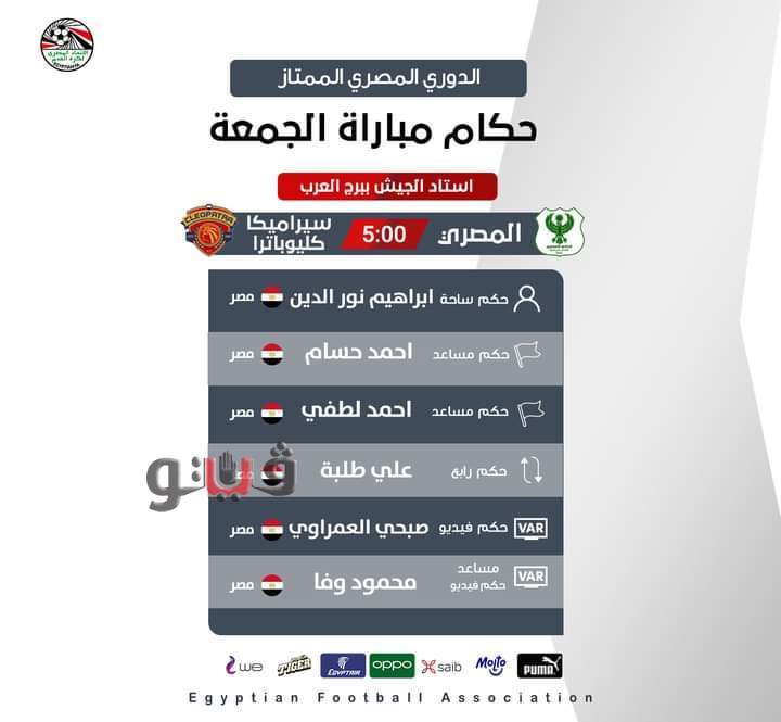 أعلنت لجنة الحكام الرئيسية بالاتحاد المصري لكرة القدم، أسماء حكام مباراة المصري وسيراميكا كليوباترا، التى تقام اليوم الجمعة بالدوري المصري الممتاز على النحو التالي :