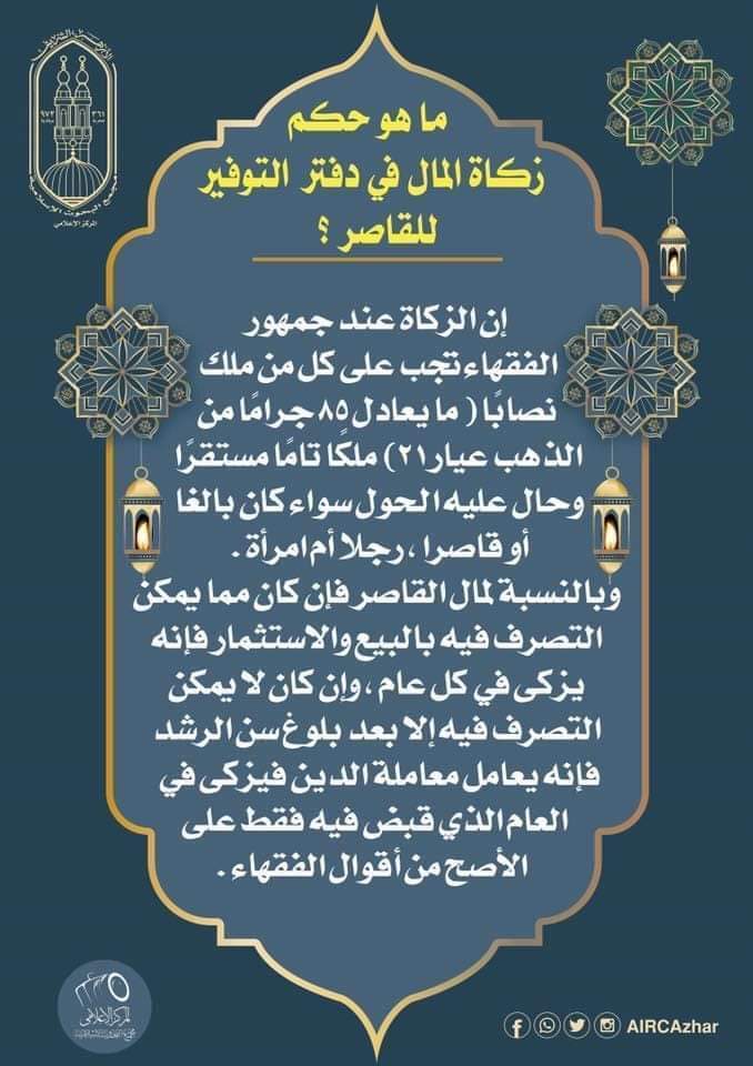 ورد سؤال إلي لجنة الفتوى بمجمع البحوث الإسلامية بالأزهر الشريف يقول فيه صاحبه: "ما هو حكم زكاة المال في دفتر التوفير للقاصر؟" وجاء رد اللجنة على هذا السؤال كالتالي: