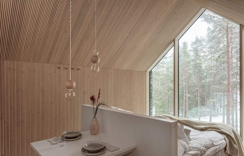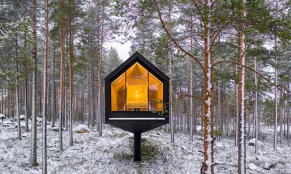 وبنيت هذه الأكواخ المعلقة الأنيقة بالقرب من حديقة، في فنلندا، على عمود واحد، حيث تمنح ساكنها ”شعورًا بالانفصال عن المخاوف والمشاغل اليومية التي تحدث على الأرض“.