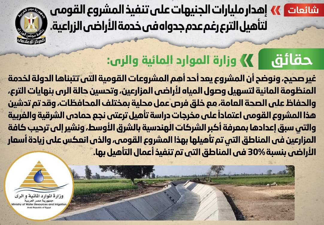 وتواصل المركز الإعلامي لمجلس الوزراء مع وزارة الموارد المائية والري، والتي نفت تلك الأنباء، مُؤكدةً أنه لا صحة لإهدار مليارات الجنيهات على تنفيذ المشروع أو عدم جدواه في خدمة الأراضي الزراعية.