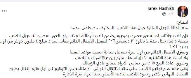 وفي هذا الصدد خرج طارق حشيش المستشار المالي للزمالك ليوضح من جديد موقف الزمالك من عقد اللاعب عقب نهاية إعارته وذلك من خلال صفحته الرسمية على الفيس بوك على النحو الآتي:
