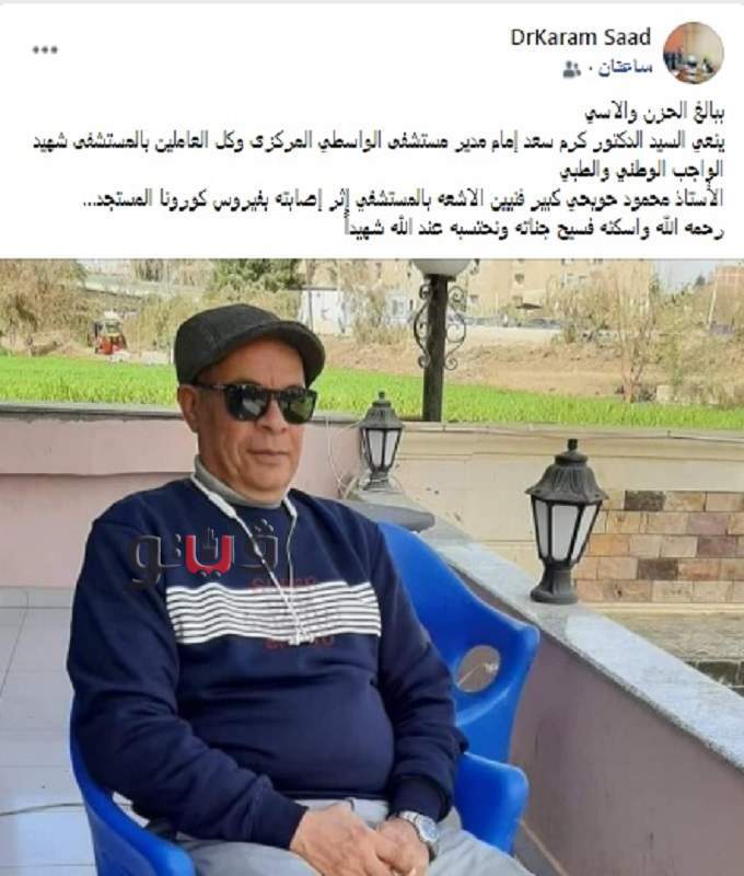 ونشر مدير مستشفى الواسطى، منشورًا عبر حسابه الشخصي على "فيس بوك" قال فيه: "ببالغ الحزن والاسي ينعي الدكتور كرم سعد إمام، مدير مستشفى الواسطي المركزي، وكل العاملين بالمستشفى، شهيد الواجب الوطني والطبي "محمود حويحي" كبير فنيين الاشعة بالمستشفى، إثر إصابته بفيروس كورونا المستجد، رحمه الله واسكنه فسيح جناته ونحتسبه عند الله شهيداً".