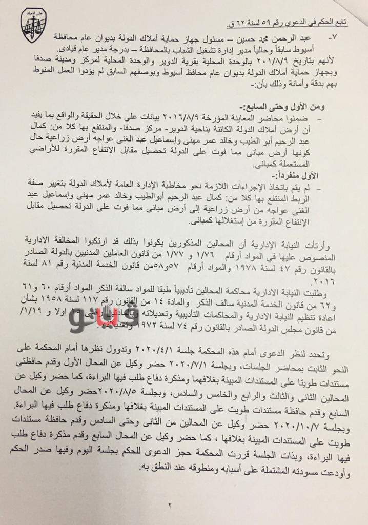 أصدرت المحكمة التأديبية العليا بمجلس الدولة حكمها في القضية رقم 59 لسنة 62 قضائية عليا ببراءة 7 مسؤولين بمحافظة أسيوط والوحدة المحلية لمركز ومدينة صدفا والضرائب العقارية لعدم تحديد على وجه الدقة أوجه المخالفة والقصور في أداء كل منهم لأعمال وظيفته ودرجة مساهمته في ارتكاب المخالفة.