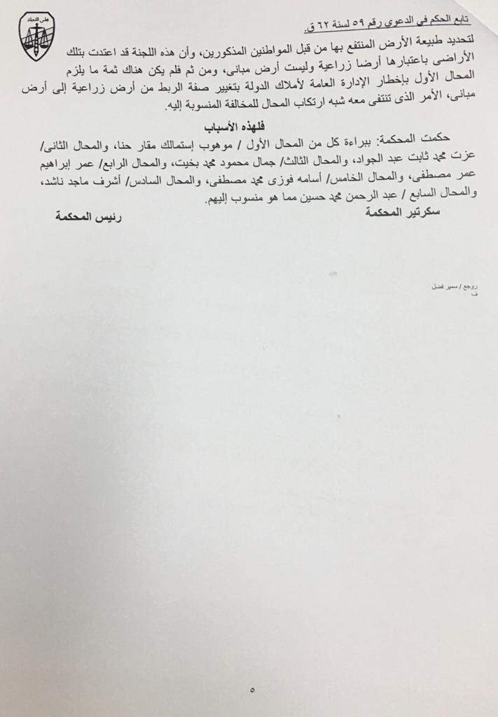 وفيما يتعلق بالمخالفة المنسوبة إلى المحال الأول منفردًا، فإنه ومتى انتهت المحكمة إلى عدم ثبوت المخالفة المنسوبة لجميع المحالين، بصفتهم أعضاء اللجنة المشكلة لتحديد طبيعة الأرض المنتفع بها من قبل المواطنين المذكورين، وأن هذه اللجنة قد اعتدت بتلك الأراضي باعتبارها أرضا زراعية وليست أرض مباني، ومن ثم فلم يكن هناك ثمة ما يلزم المحال الأول بإخطار الإدارة العامة لأملاك الدولة بتغيير صفة الربط من أرض زراعية إلى أرض مبان، الأمر الذي تنتفي معه شبه ارتكاب المحال للمخالفة المنسوبة إليه، ولهذه الأسباب أصدرت المحكمة حكمها المتقدم بالبراءة.