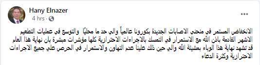 وكتب هاني الناظر تدوينة على الفيس بوك قال فيها "لانخفاض المستمر في منحنى الإصابات الجديدة بكورونا عالمياً وإلى حد ما محليًا والتوسع في عمليات التطعيم الأشهر القادمة بإذن الله مع الاستمرار في التمسك بالإجراءات الاحترازية كلها مؤشرات مبشرة بان نهاية هذا العام قد تشهد نهاية هذا الوباء بمشيئة الله والي حين ذلك علينا عدم التهاون والاستمرار في الحرص علي جميع الإجراءات الاحترازية وكثرة الدعاء"