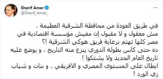 وكتب شريف عامر تغريدة على تويتر "في طريق العودة من محافظة الشرقية العظيمة. مش معقول ولا مقبول إن مفيش مؤسسة اقتصادية في مصر كلها تهتم برعاية فريق هوكي الشرقية !؟"