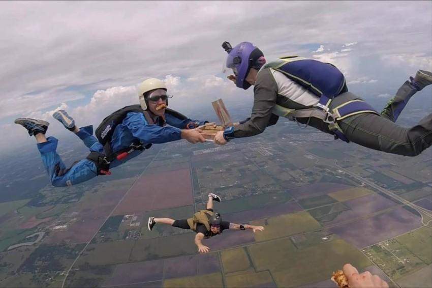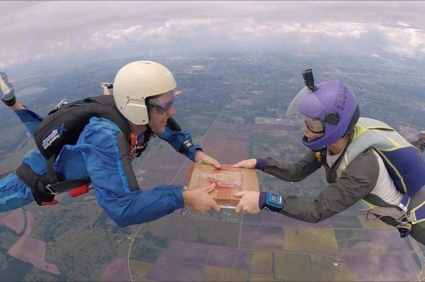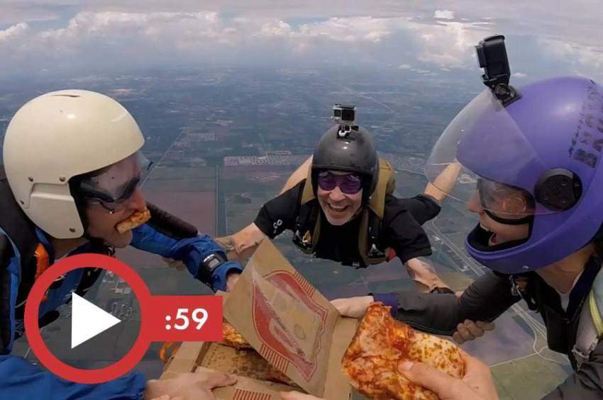 أثبت فريق من هواة القفز بالمظلات في تكساس أن وجبة البيتزا الشهيرة صالحة للأكل في كل زمان ومكان بعدما تشاركوا أكل شرائح من صندوق بيتزا أثناء هبوطهم الحر من على ارتفاع نحو 4000 متر.