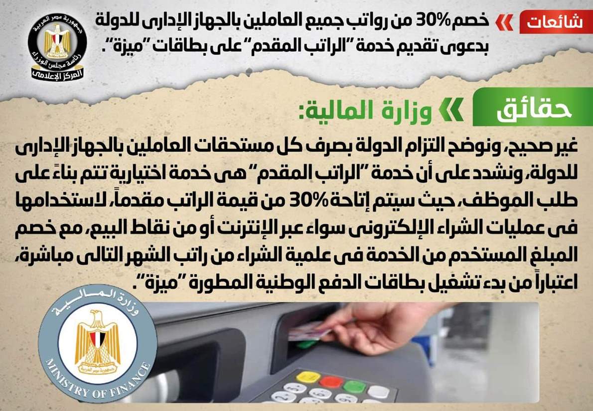 تداولت بعض وسائل الإعلام والمواقع الإلكترونية وصفحات التواصل الاجتماعي أنباء بشأن خصم 30% من رواتب جميع العاملين بالجهاز الإداري للدولة بدعوى تقديم خدمة "الراتب المقدم" على بطاقات "ميزة".