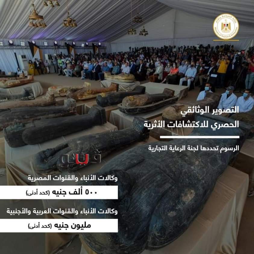 وقرر المجلس الأعلى للآثار السماح لوكلات الأنباء والقنوات المصرية مقتبل سداد 500 ألف جنيها كحد أدنى، ومليون جنيها كحد أدنى لوكلات الأنباء والقنوات العربية والأجنبية.