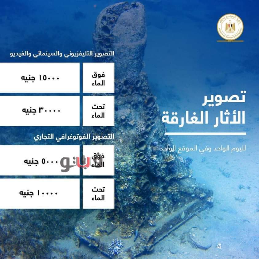 وتابعت المصادر، أن أسعار التصوير التليفزيوني والسينمائي والفيديو للآثار الغارقة فوق الماء تبدأ من 15 ألف جنيها، و 30 جو ألف جنيها تحت الماء، وذلك لمدة يومي واحد في موقع واحد فقط، كما تم السماح بالتصوير الفوتوغرافي التجارى للآثار الغارقة فوق الماء ب 5000 جنيها، و 10000 جنيها للتصوير تحت الماء .