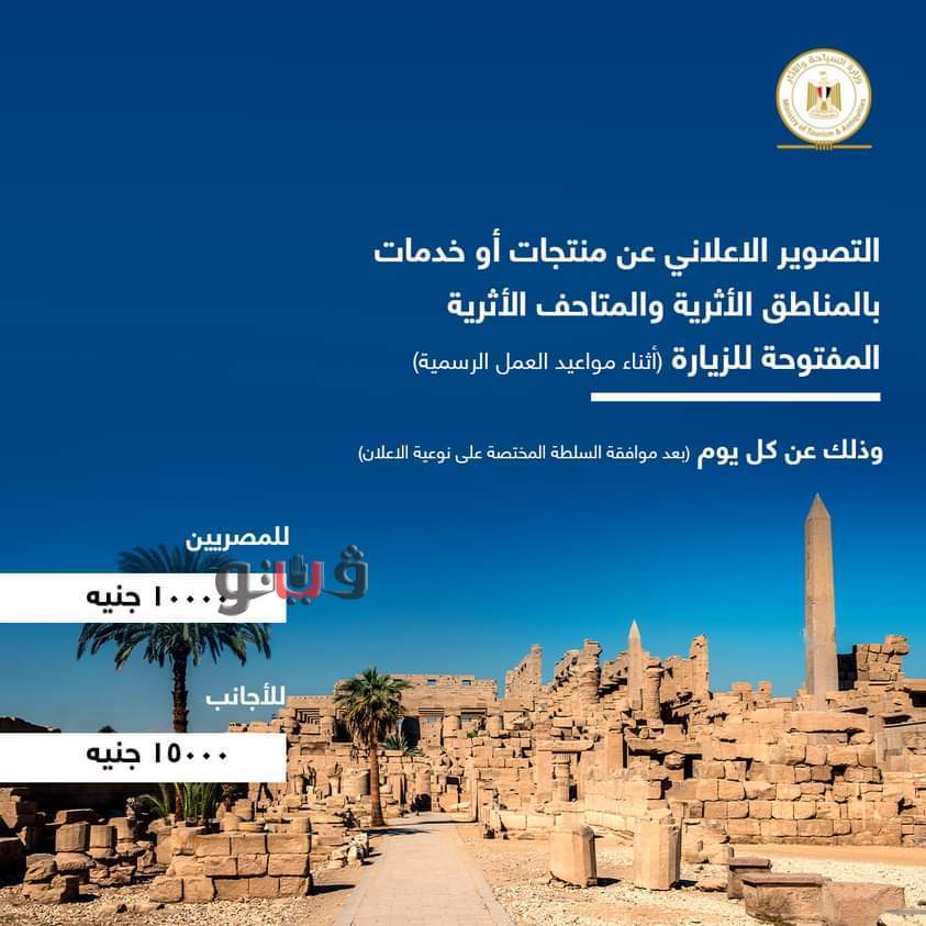 واعلنت مصادر مطلعة بوزارة السياحة والآثار عن الأسعار الجديدة للتصوير داخل المواقع الأثرية والمتاحف بمختلف أنواعها لتصوير الأفلام التسجيلية والوثائقية والتصوير التجاري بجميع المواقع الأثرية والمتاحف المفتوحة للزيارة والمقابر المغلقة وذلك أثناء مواعيد العمل الرسمية.