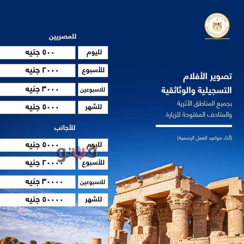 وأكدت المصادر أن خطة تصوير الافلام التسجيلية والوثائقية تبدأ من 500 جنيها في اليوم الواحد للمصريين، و 2000 جنيها للأسبوع و 3000 جنيها للأسبوعين و 5000 جنيها للشهر، وفيما يخص الزائرين الأجانب فتبدأ الأسعار من 5000 جنيها لليوم الواحد، و 20 ألف جنيها للأسبوع، و 30 ألف جنيها للأسبوعين، و 50 ألف جنيها للشهر.