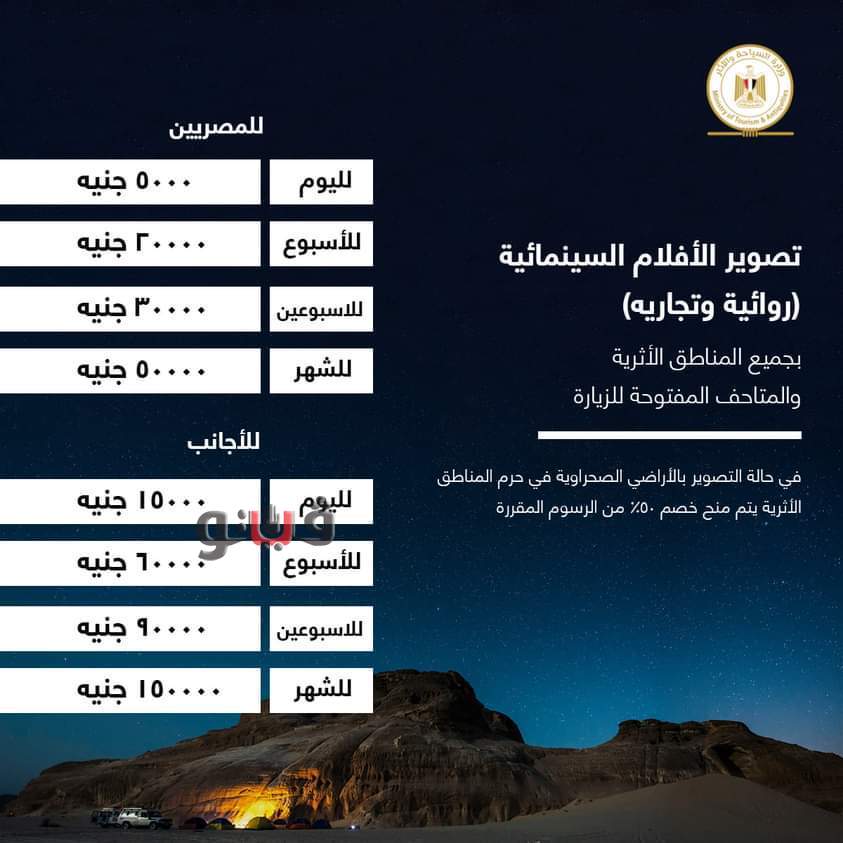 وأشارت المصادر الي أن أسعار تصوير الافلام السينمائية " الروائية والتجارية" بجميع المواقع والمتاحف الأثرية المفتوحة للزيارة تبدأ من 5000 جنيها لليوم الواحد للمصريين و 20 ألف جنيها للأسبوع و 30 ألف جنيها للأسبوعين، و 50 ألف جنيها للشهر، وفيما يخص الأجانب، فيتم السماح بالتسجيل مقابل سداد 15 ألف جنيها لليوم الواحد، و 60 ألف جنيها للأسبوع، و 90 ألف جنيها للأسبوعين، 150 ألف جنيها للشهر، وأنه في حال التصوير بالأراضي الصحراوية فى حرم المناطق الأثرية ينم منح تخفيض 50% من الرسوم المقررة.