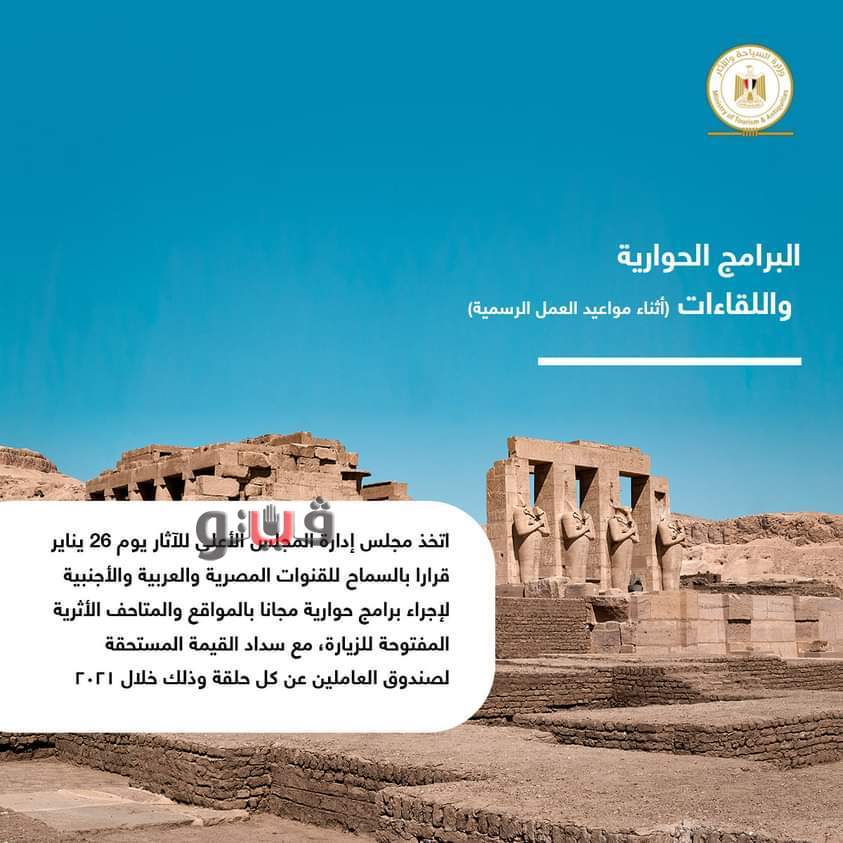 وأوضحت المصادر المصادر ان المجلس الأعلى للآثار اتخذ قرارا بالسماح للقنوات المصرية والعربية والأجنبية بإجراء برامج حوارية مجانا بالمواقع والمتاحف الأثرية المفتوحة للزيارة مع سداد القيمة المستحقة لصندوق العاملين عن كل حلقة.