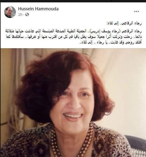 وكتب الناقد الكبير الدكتور حسين حمودة، على صفحته الشخصية بـ"فيس بوك": "رجاء الرفاعي.. إلى لقاء.. الجميلة الطيبة المبدعة المبتسمة التي عاشت متفائلة دائما".