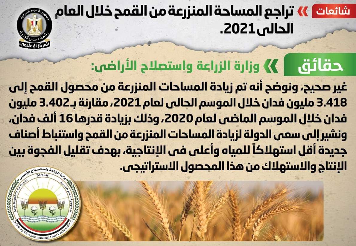 أُثير في بعض المواقع الإلكترونية وصفحات التواصل الاجتماعي أنباء بشأن تراجع المساحة المنزرعة من القمح خلال العام الجاري 2021.