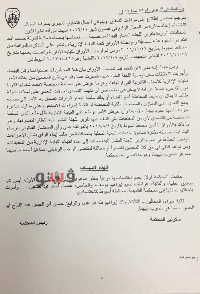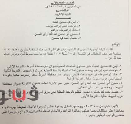 وتضمن الحكم في القضية رقم 89 لسنة 62 قضائية عليا عدم اختصاصها نوعيا بنظر الدعوى بشأن 3 مسئولين آخرين، وقررت إحالتها بحالتها الى المحكمة التأديبية بأسيوط للاختصاص.